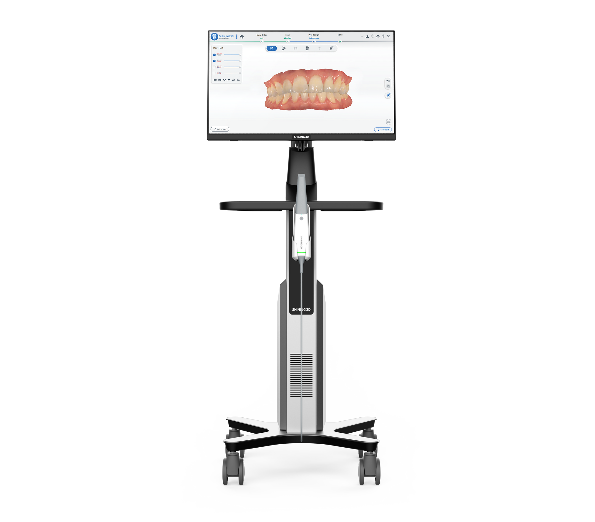 The touchscreen all-in-one AoStation is compatible with SHINING 3D Aoralscan 3 and Aoralscan 3 Wireless intraoral scanner, allowing for the effortless use of intraoral scanner in dental clinics.