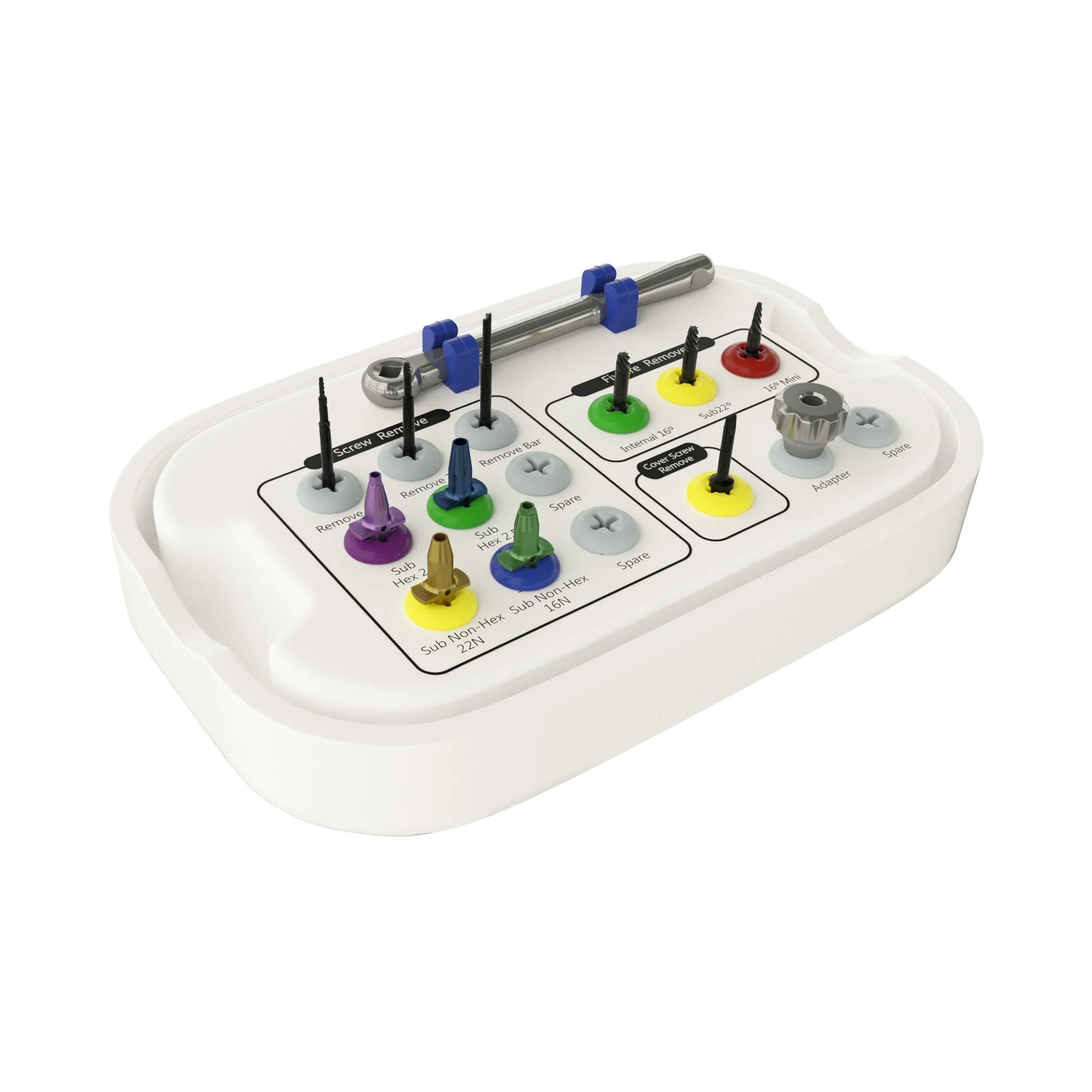The kit contains extraction drills that fit a wide array of platforms and implant sizes found in the dental market. It also features reverse and tap drills made for the extraction of broken or fractured screws from implants. The removal drill tools' tapered bodies seamlessly engage with the internal threads of both the implant and screw, facilitating effortless and rapid extraction, including implants already integrated into bone structures.