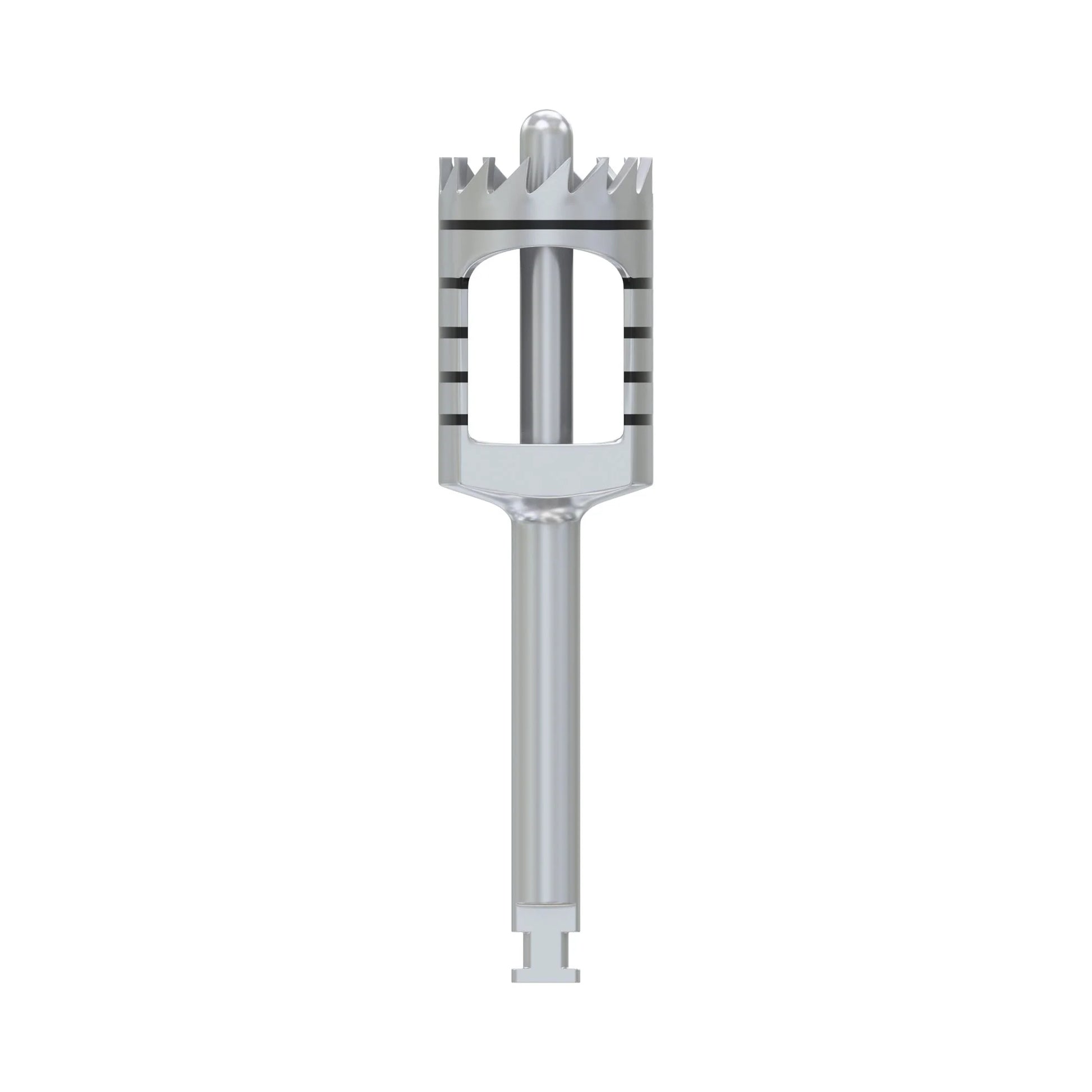 DSI Trephine drills with a central pin are made for conducting a precise socket for a bone ring. The drills have an integrated central pin that stabilizes the drill during the procedure and delivers filigree accuracy for the socket. To begin the drilling sequence with this trephine drill, first, you need to perform an initial socket preparation with a lance drill to center the pin in it.