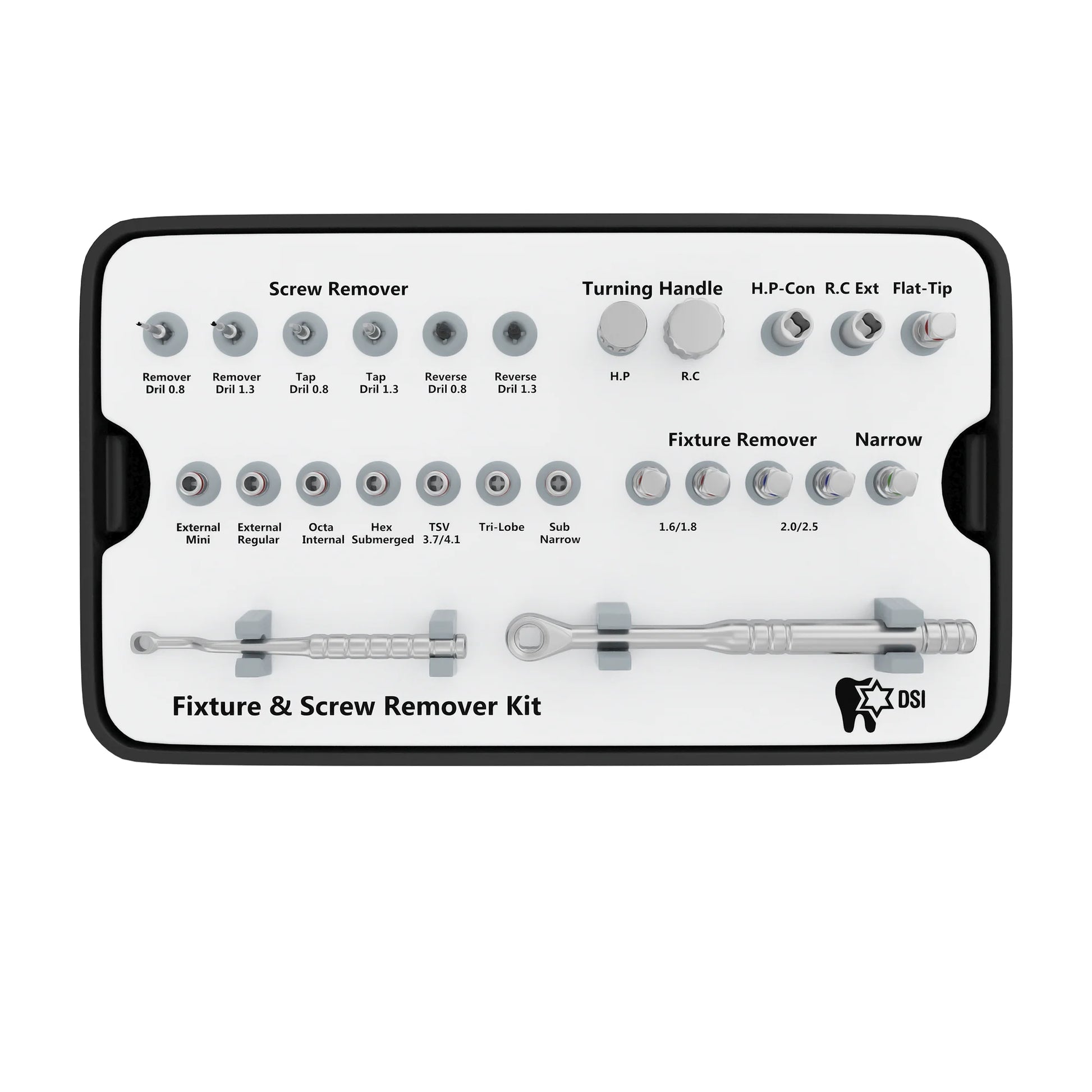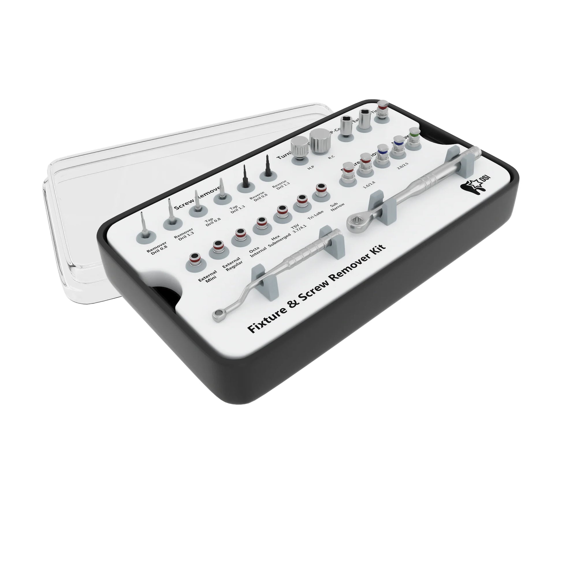 The kit includes extraction drills that are able to fit most of the platforms and implant sizes available on the dental market. It also includes reverse and tap drills for extracting broken and fractured screws from the implants. The tapered body of the removal drill tools engages with the internal threads of the implant and the screw and allows easy and fast removal. Any sort of implant can be extracted including the ones that are already osseointegrated into a bone structure.