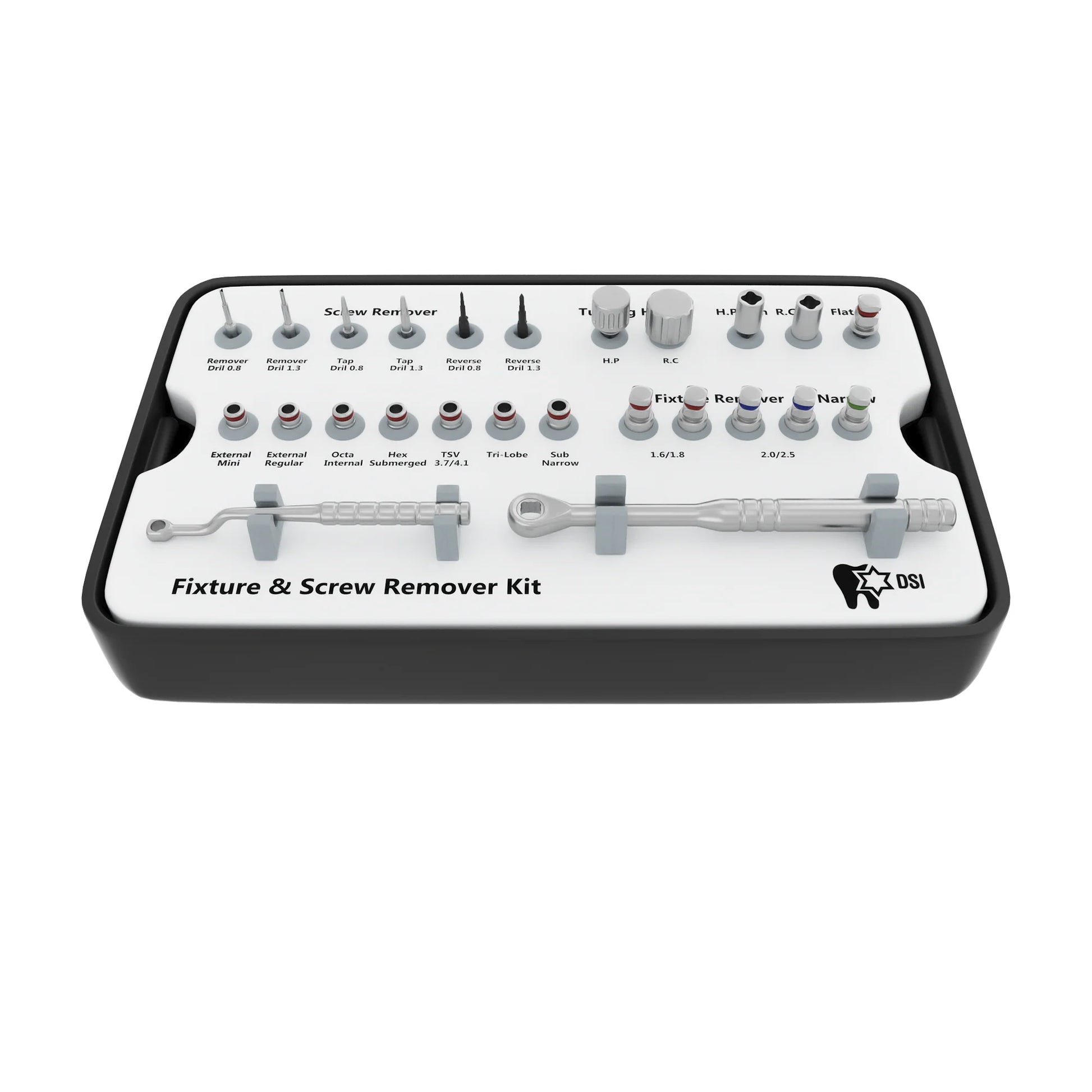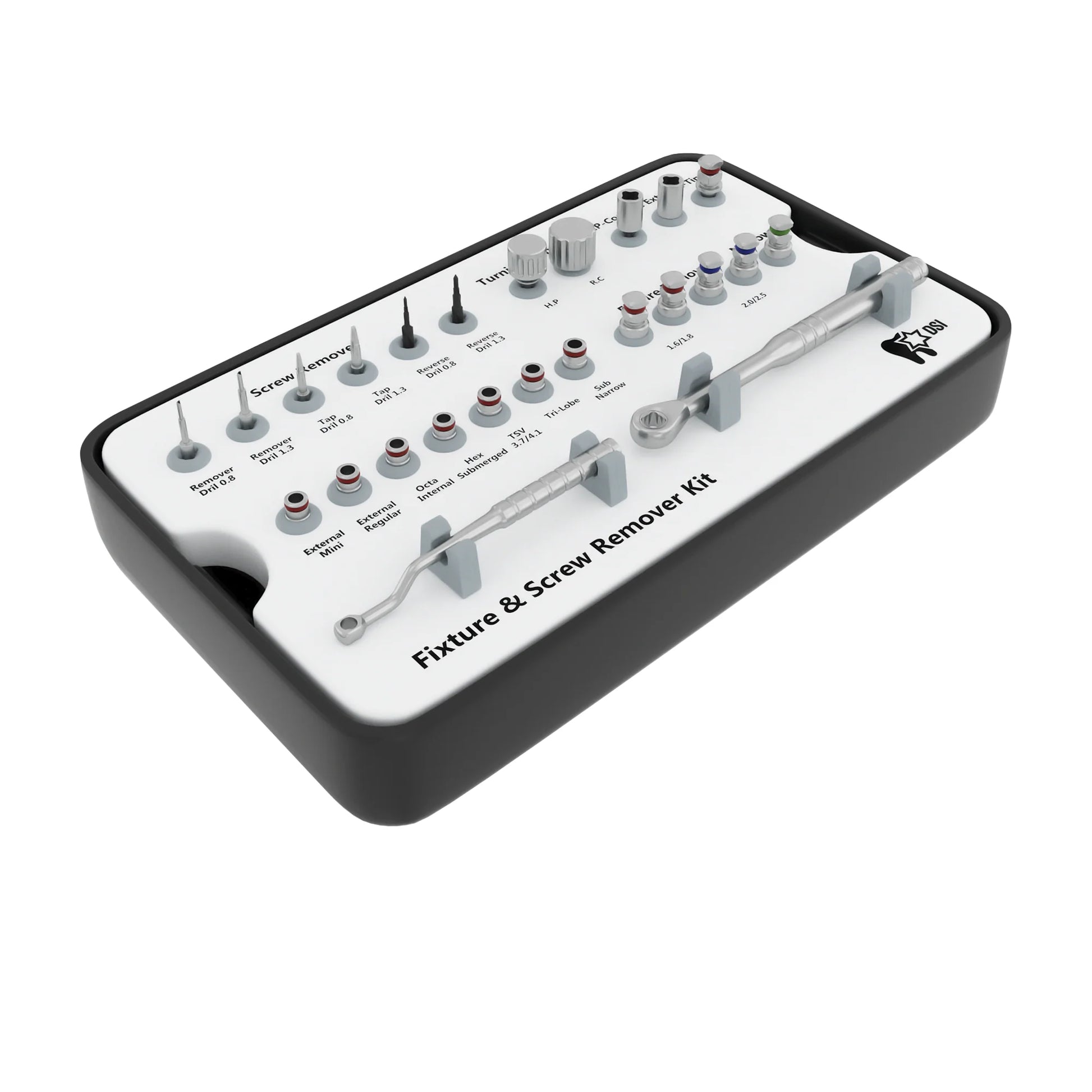 DSI Implant & Screw Removal Kit is designed specifically for the extraction of broken, ill-fit, or misplaced implants. As well as removing and extracting a broken or fractured fixation screw from the implant's inner thread. This is not an invasive solution without the need for surgical intervention. The procedure is fast, reliable, and not traumatic for the patient. When the broken screw is lifted from the implant it then can be replaced by a new prosthetic solution with a new fixation screw.