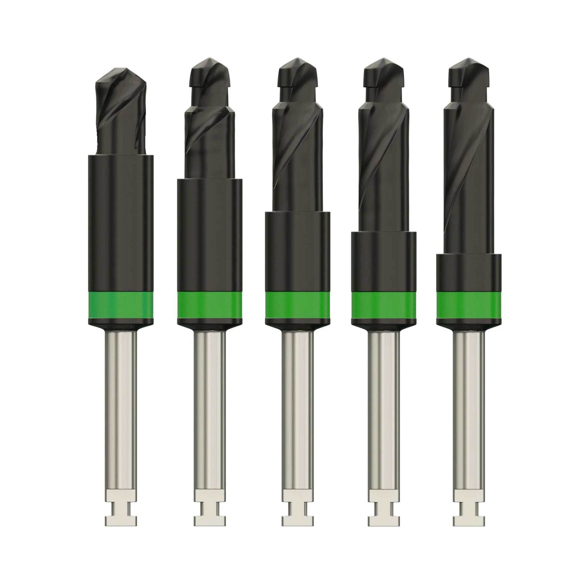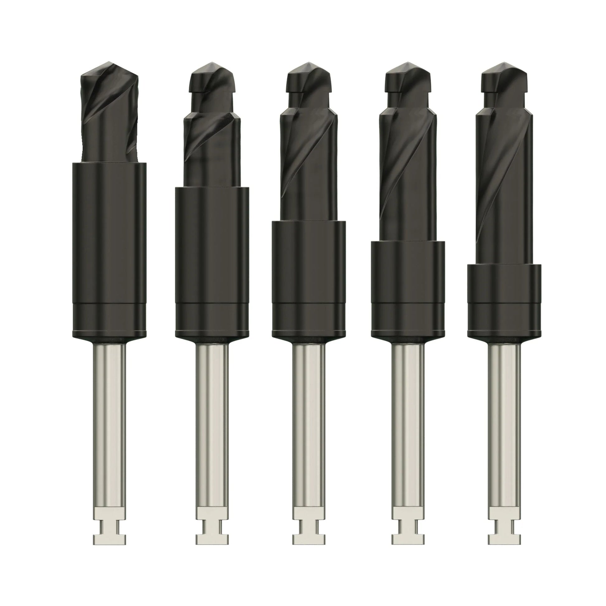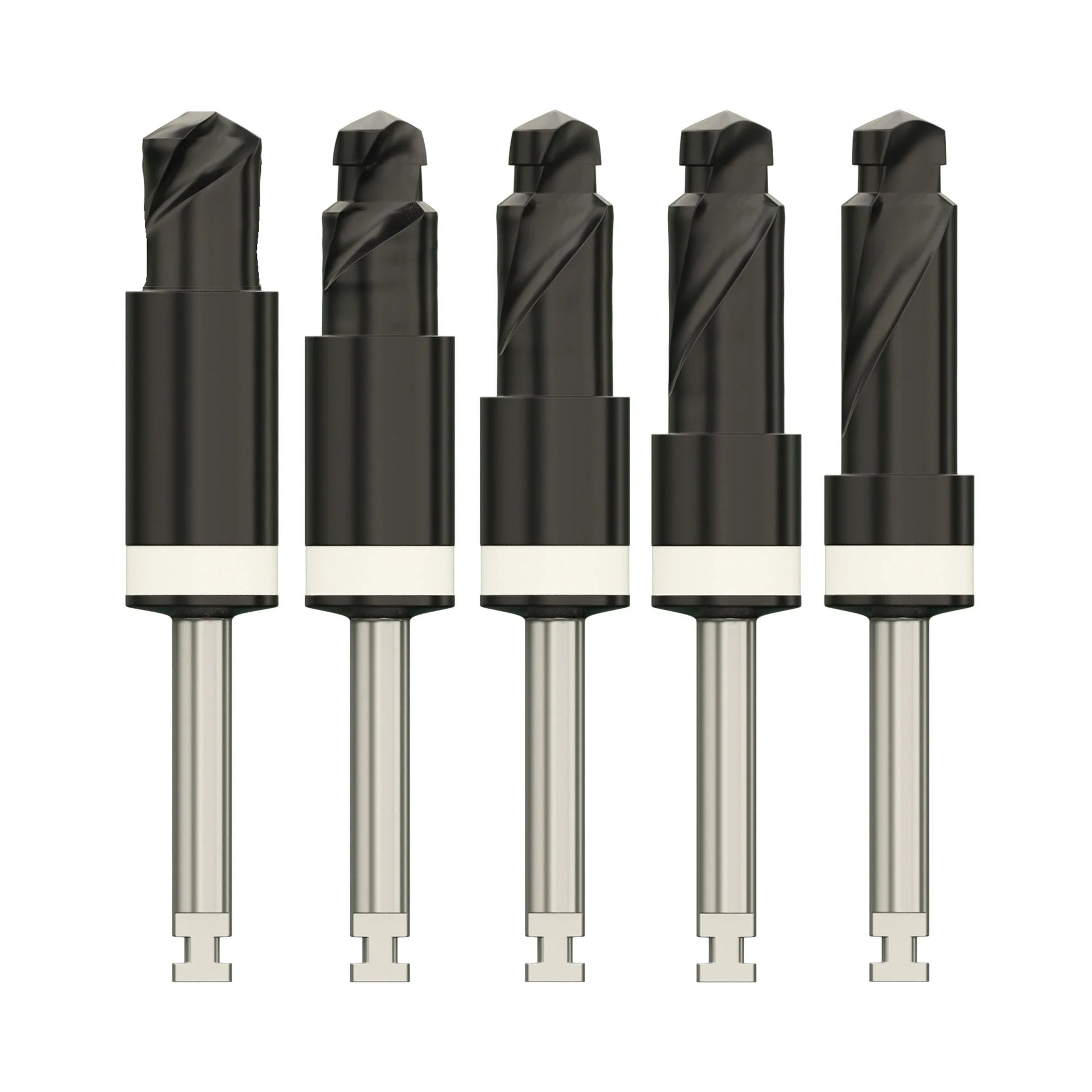 DSI Step&Stop drills are the most efficient instruments for precise drilling. These drills are uniquely built with each drill leading the following for fast and accurate drilling. The drill dimension and shape reflect the closest match to the implant geometry. It benefits from a built-in integral stopper, perfect balance, and an optimized cutting edge with a Diamond-like Carbon DLC coating. DSI Step&Stop drills adjust the socket to reduce the pressure on the implant neck and increase the stability in a deeper socket area. The drilling protocol is shorter with these drills, allowing faster implant installation, reduced healing time, and better final results.