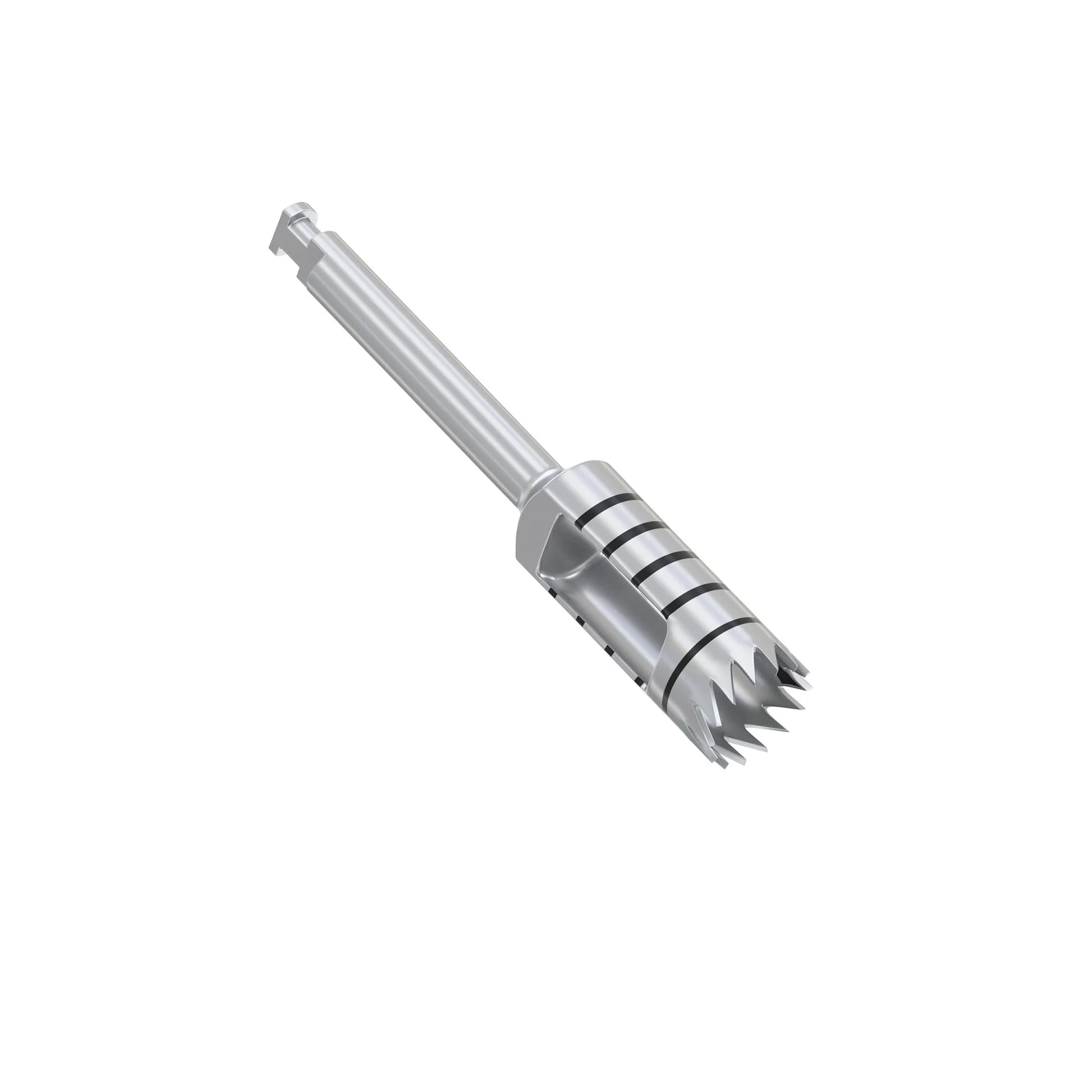 DSI Trephine Drills have a latch-type (RA) connection that can be connected with any contra-angle handpiece and is made of high-quality stainless steel, autoclavable, and reusable.