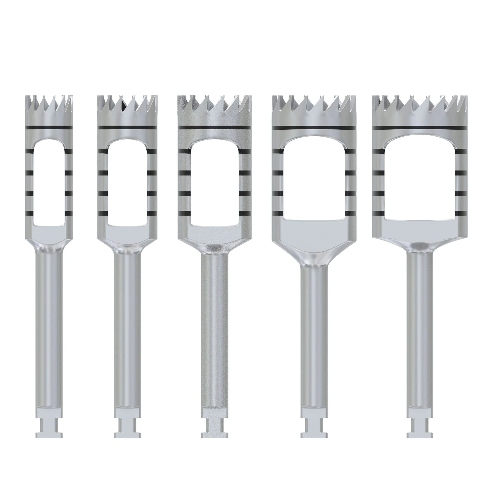 The drills prevent damage to the bone since they only touch a single point at its apex. They have laser-marked score lines to determine the depth of the socket and are perforated for better air circulation and reduced heat generation.